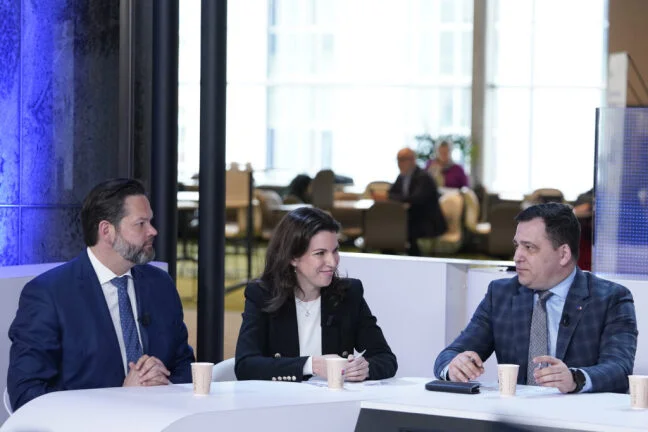 Europoslanci Lukas Mandl (vlevo) a Tomáš Zdechovský (vpravo), expertka z Institutu pro centrální Evropu Katarína Cséfalyová (uprostřed). Foto: Evropský parlament